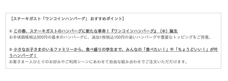 株式会社すかいらーくレストランツ(本社・東京都武蔵野市、代表取締役社長 中島 尚志)が運営するステーキガストでは、2023年4月13日(木)より、「ワンコインハンバーグ」の提供を開始し、ハンバーグのラインアップを拡充します。