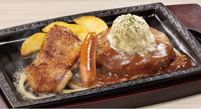 ワンコインハンバーグ(約110g)+炭焼き風チキングリル+ソーセージ+特製ガーリックバター