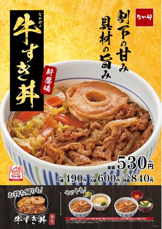 株式会社なか卯(代表取締役社長:向山 陽 本社:東京都港区)が展開する丼ぶりと京風うどんの「なか卯」は、4月20日(木)AM11:00より「牛すき丼」を販売します。