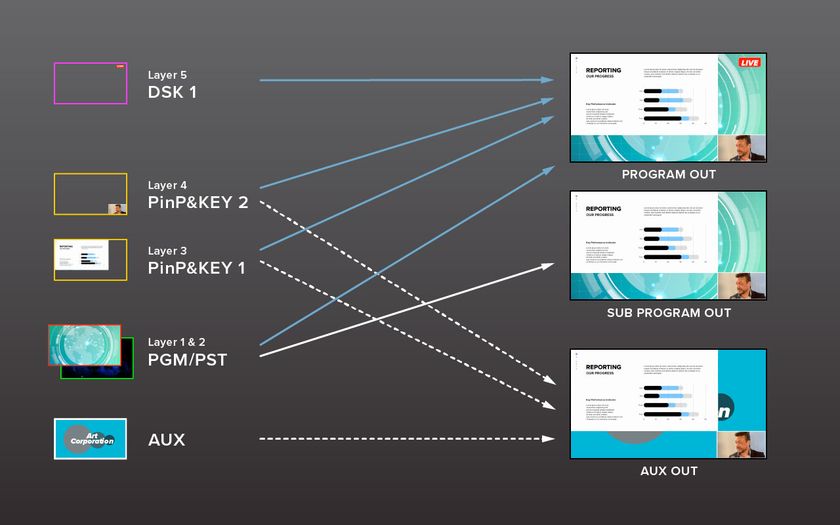 観客や視聴者を惹きつける演出を実現するため、映像合成とエフェクト機能は重要な要素です。『VR-6HD』は、最大5レイヤーまで対応した映像合成が可能。最大2つのピクチャー・イン・ピクチャー&キーとDSK(ダウンストリーム・キー)を使い、多様なニーズにも柔軟に対応できます。
