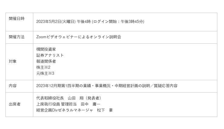 このまま多くの皆様にご参加いただけるよう、2023年12月期第1四半期以降も引き続き、ビデオ会議ツール「Zoom」を利用し、オンラインにて説明会を実施することにいたしましたのでご案内申し上げます。