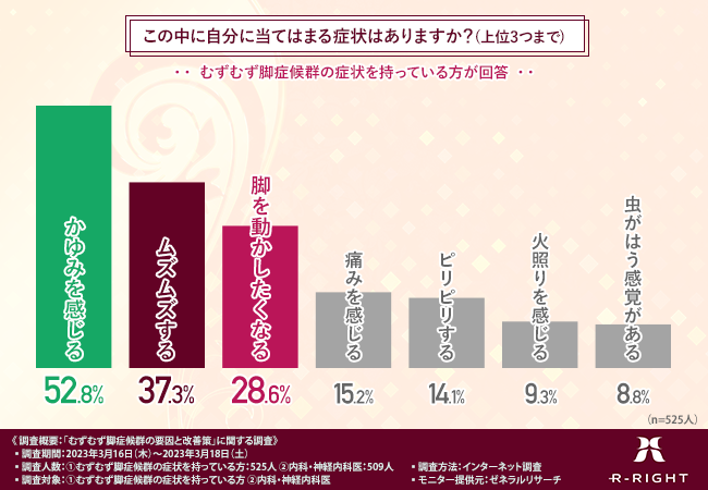 そこで今回、サプリメントの『むずむずクリア』(https://muzumuzuclear.com/lp?u=a)を販売している株式会社アールライトは、1.むずむず脚症候群の症状を持っている方、2.内科・神経内科医を対象に、「むずむず脚症候群の要因と改善策」に関する調査を実施しました。