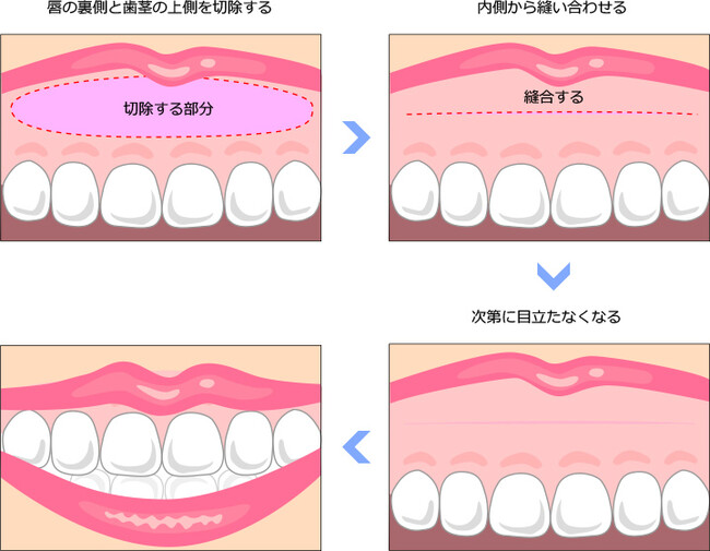 上唇と歯肉の間の粘膜を切除し、歯茎の見える範囲を調整した位置で再度縫合します。