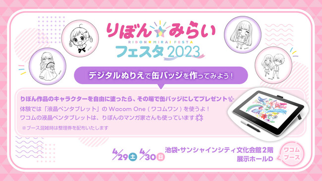株式会社ワコムは、4月29日(土・祝)、30日(日)に池袋サンシャインシティ文化会館ビルで開催される『りぼん☆みらいフェスタ2023』(主催:集英社)にブースを出展します。