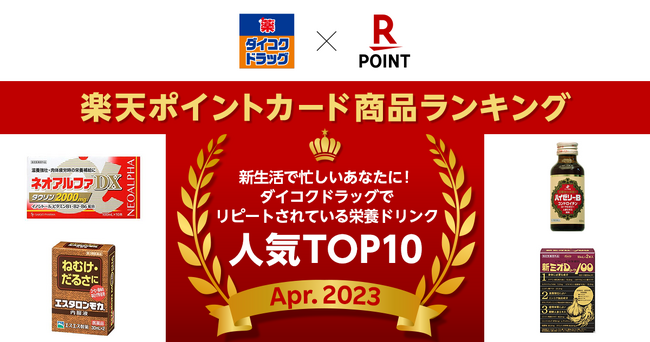 株式会社ダイコク(以下「ダイコク」)と楽天ペイメント株式会社(以下「楽天ペイメント」)は共同で、「楽天ポイントカード商品ランキング」において「新生活で忙しいあなたに!ダイコクドラッグでリピートされている栄養ドリンク人気TOP10」を発表しました。
