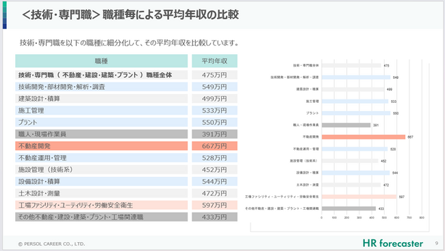 平均年収が最も高い職種は、土地を買い取り、分譲して戸建・マンションを建築・販売する「不動産開発」で、667万円でした。2位は、施設や工場の機器、環境を管理する「工場ファシリティ・ユーティリティ・労働安全衛生」で597万円、3位は石油・化学など、工業活動に必要な素材や資源を作り出すための生産設備を建設・管理する「プラント」で550万円となりました。