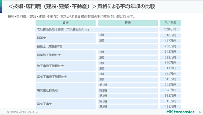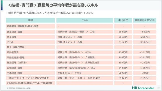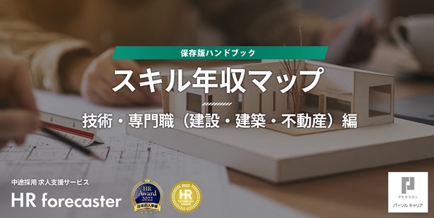 転職サービス「doda」などを提供するパーソルキャリア株式会社が運営する100万件の転職統計データを活用した求人要支援サービス「HR forecaster(エイチアール フォーキャスター)」< https://hr-forecaster.jp/ >は、職種×スキルの平均年収がわかるデータ「保存版ハンドブック スキル年収マップ」の第5弾として、「技術・専門職(建設・建築・不動産)編」を2023年4月20日(木)に公開しました。今後は、「金融・保険専門職編」などのスキル年収マップを順次公開する予定です。