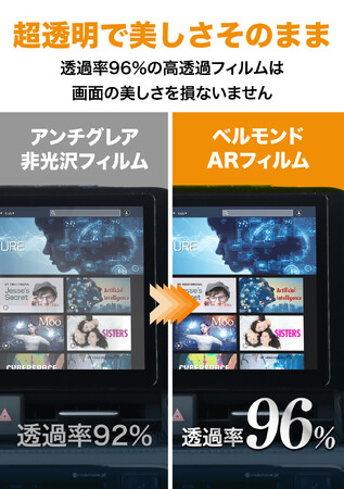 反射率1.1%の低反射フィルムなので、反射や映り込みを軽減し、明るい車内でも画面が見やすくなります。