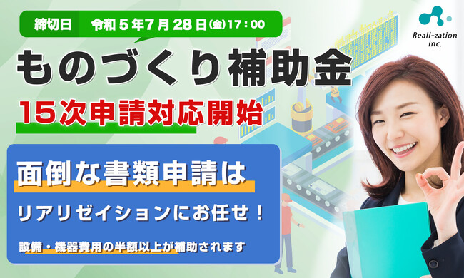 株式会社リアリゼイション(東京都渋谷区)は、「ものづくり補助金」の15次(締切:令和5年7月28日(金)17時)の申請代行サポートを開始!
