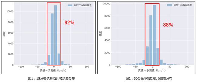 ・ 15分後の車速予測は、全道路のうち92%以上が誤差±20km/h以内(図1)に収まる結果。