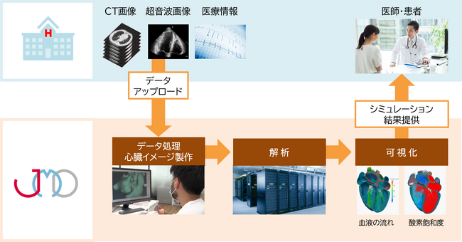 ped UT-Heartによる臨床判断支援サービスは、クラウド形式のサービスとして提供する予定です。これにより医療機関は機器の導入や専門技術者等を配置することなく、従来の医療データを提供するだけでシミュレーション結果を得ることが可能です。JMDでは、医療機関からアップロードされたデータを基に、必要な画像処理を行い、心臓シミュレータで解析を行い、解析結果を基に医療観点からレポートを作成、その結果を医師に提供します。