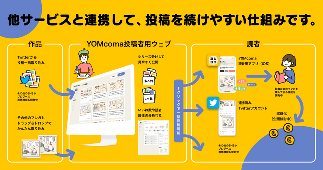 「YOMcoma」は、β版のリリースから27日間で、投稿者の作品を読まれた回数が合計100万件を突破いたしました。現在、新たな仕組みによる収益還元機能など、ショートマンガを創作するクリエイターの支援となるサービスを複数検討中です。これからもクリエイターひとりひとりの「なりたい姿」を応援し、「困りごと」の解決を目指し、新たな価値提供を行ってまいります。