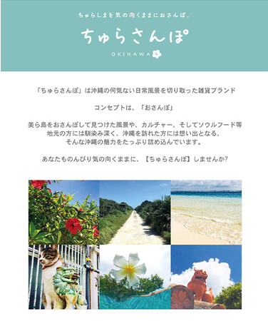 『ちゅらさんぽ』シリーズって?【ちゅらさんぽ】は沖縄の何気ない日常風景を切り取ったデザインを活かした雑貨ブランドコンセプトは【お散歩】美ら島をお散歩して見つけた風景や、カルチャー、そしてソウルフード等地元の方には馴染み深く、沖縄を訪れた方には想い出となる。そんな沖縄の魅力をたっぷり詰め込んでいます。