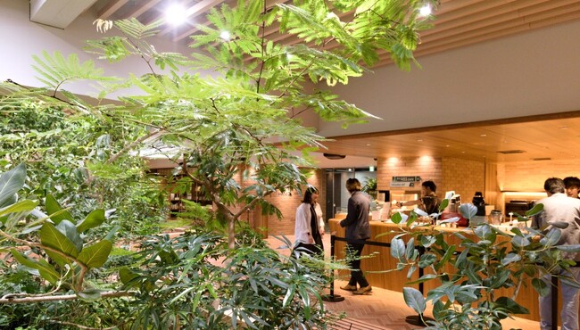 新たなオフィスは、本物の木々が訪れた人に安らぎを与える「公園・森」が中心の空間です。公園に集まった人々が、約6,000冊を収蔵する「図書館」で本に囲まれて自らの襟を正しながら、味と香りで対話を彩る「カフェ」で創造性を高められるように設計されました。出社率は改装前(2022年8月時点)の36.8%から、改装後は23年3月単月で65.6%の水準に向上しました。