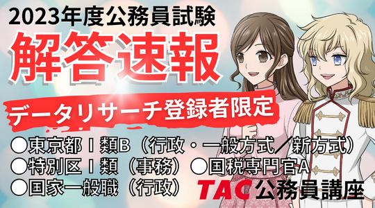 多くの受験生が参加するTACの本試験データリサーチによるデータ分析に、ぜひ積極的にご参加ください。TAC以外の受験生の方もご参加いただけます。また、ご登録いただいたくと、公務員試験「東京都I類B[行政/一般方式]採用試験」・「特別区I類[事務]採用試験」専門記述試験・論文試験 TAC解答速報 をご覧いただけます。