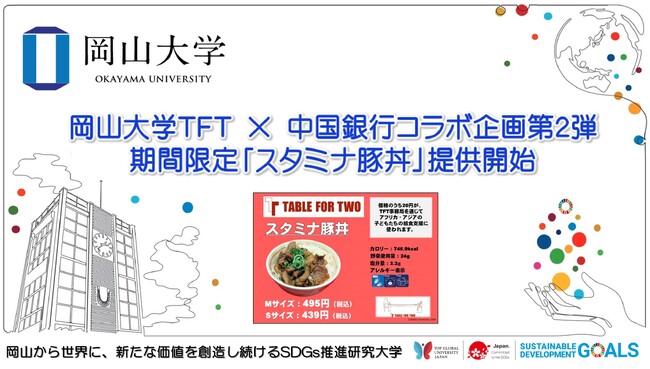 ◆概 要 国立大学法人岡山大学(本部:岡山市北区、学長:那須保友)は、2019年4月より岡山大学TFTが企画し、岡山大学生活協同組合で提供しているTFT(TABLE FOR TWO)メニュー。今回は中国銀行とのコラボレーション企画の第2弾として、本学津島キャンパスのピーチユニオン大学生協食堂にて期間限定の「スタミナ豚丼」を提供することが決まりました。