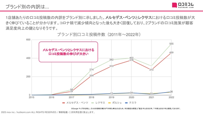 ・レクサス、ベンツの新規口コミ投稿数の伸びが大きく、またコロナ禍からの回復が早かったこと