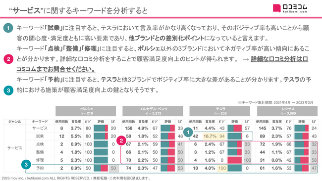 キーワード「試乗」に注目すると、テスラにおいて言及率がかなり高くなっており、そのポジティブ率も高いことから顧客の関心度・満足度ともに高い要素であり、他ブランドとの差別化ポイントになっていると言えます。キーワード「点検」「整備」「修理」に注目すると、ポルシェ以外の3ブランドにおいてネガティブ率が高い傾向にあることが分かります。詳細な口コミ分析をすることで顧客満足度向上のヒントが得られます。 → 詳細な口コミ分析は口コミコムまでお問合せください。キーワード「予約」に注目すると、テスラと他3ブランドでポジティブ率に大きな差があることが分かります。テスラの予約における施策が顧客満足度向上の鍵となりそうです。レポートでは、"接客"・"店舗"に関するキーワードについても分析しております。詳細は、資料ダウンロードにてご確認ください。レポートURL→ https://academy.kutikomi.com/whitepapers/202304_luxurycardealer/?utm_source=pressrelease&utm_medium=prtimes&utm_campaign=202304_luxurycardealer■ 口コミサイトを”もっと”売上に変える「口コミコム」とは