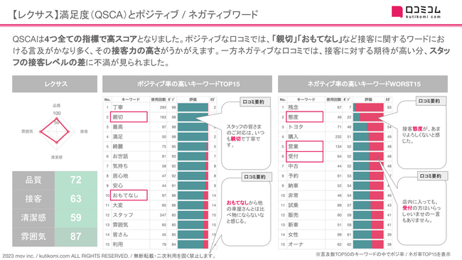 1店舗あたりの口コミ投稿数の内訳をブランド別に示しました。メルセデス・ベンツとレクサスにおける口コミ投稿数が大きく伸びていることが分かります。コロナ禍で減少傾向となった後も大きく回復しており、2ブランドの口コミ施策が顧客満足度向上の鍵となりそうです。レポートURL→ https://academy.kutikomi.com/whitepapers/202304_luxurycardealer/?utm_source=pressrelease&utm_medium=prtimes&utm_campaign=202304_luxurycardealer■ 【レクサス】の口コミで多用されるワードを分析してみると...口コミコムを利用すると、GoogleマップやYahoo! MAPなどに投稿されるすべての口コミを自動でAI解析できます。顧客満足度を表すQSCA(Q:品質、S:サービス、C:清潔さ、A:雰囲気)に関する口コミを抽出し、それらの口コミがポジティブなのかネガティブなのか、文脈から判定し自動でスコアリングしています。今回は、このAI解析を用いて【レクサス】のQSCA・ポジ / ネガキーワードを確認しました。