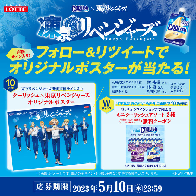 株式会社ロッテは“飲むアイス”の「クーリッシュ」ブランドにて、大人気アニメ「東京リベンジャーズ」と初のコラボ、“凍京リベンジャーズ”Twitterフォロー&リツイートキャンペーンを実施します。2023年4月24日(月)から2023年5月10日(水)の期間、ロッテ クーリッシュ公式Twitterアカウントをフォローし、対象ツイートをリツイートすると、抽選で10名様に出演声優サイン入りオリジナルポスターをプレゼントします。また、はずれた方の中からさらに抽選で10名様にロッテオンラインショップで使えるミニクーリッシュアソート2種×10個入無料クーポンをプレゼント。ポスターのデザインは、今回のコラボレーションのために描き下ろされたイラストに出演声優3名のサイン入りになります。超COOLな初コラボのキャンペーンにぜひ奮ってご応募ください。