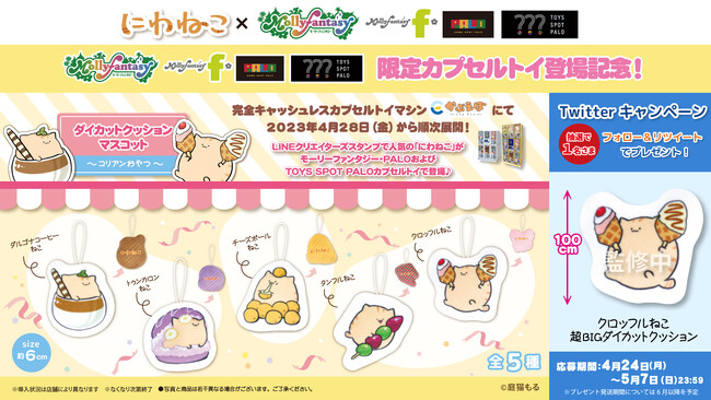 限定カプセルトイ用景品の展開を記念し、モーリーファンタジー公式 Twitterで全長約100cmの「クロッフルねこ 超BIGダイカットクッション」が当たるプレゼントキャンペーンを開催いたします。