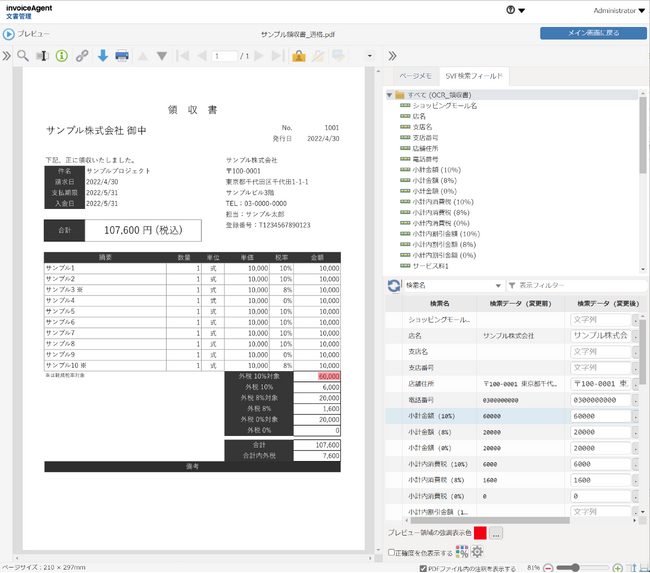 ・インボイス制度に必要な「事業者登録番号」「10%対象の項目」「8%対象の項目」を「CLOVA OCR」でデータ化し、「invoiceAgent 文書管理」上でインボイス制度に対応した運用が可能になります。