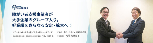 Visionalグループの株式会社M&Aサクシード(所在地:東京都渋谷区/代表取締役社長:金 蓮実)が運営する法人・審査制M&Aマッチングサイト「M&Aサクシード」(https://ma-succeed.jp/)は、「M&Aサクシード」経由で、ソーシャルサービス大手の「ソシオークホールディングス株式会社」(所在地:東京都、以下ソシオークグループ)が、福岡県で障がい者就労継続支援事業を行う「ユアーズエバー株式会社/株式会社ニューステップ 」(所在地:福岡県、以下ユアーズエバー/ニューステップ)を譲り受けたことをお知らせします。本日、二社の対談を公開しました。
