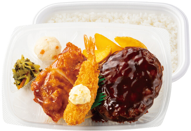 人気のハンバーグに、柔らかくジューシーな味わいが楽しめる鶏もも肉の“チキンステーキ”と“エビフライ”を組み合わせました。1食でビーフ・チキン・エビフライの豪華なおかずを味わうことができ、「あれもこれも食べたい!」という肉好きな方の思いに応えます。