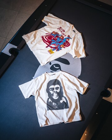 コレクションは、BAPE(R)を象徴する猿のモチーフや「Ape Shall Never Kill Ape」などの代表的なメッセージを、(C)SAINT Mxxxxxxのフィルターを通してアレンジしたグラフィックTシャツ3型。BAPE(R)のルーツの一つでもあるアメリカンコミックやトイなどからインスピレーションを得て、コミカルにグラフィックを描きました。その全てのグラフィックには、「SAINT APE」もしくは「SAINT BAPE」と、コラボレーションを表す特別なネーミングが使われています。Tシャツのボディは、しなやかで肉厚、現代的なシルエットが特徴の(C)SAINT Mxxxxxxオリジナル。そこに(C)SAINT Mxxxxxxが得意とする本格的なヴィンテージ加工を施しています。