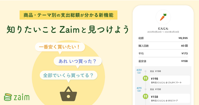 家計簿アプリ Zaim、 買ったものから買い物傾向を発見できる新機能を公開、食品の底値や“推し活”など、商品・テーマ別の支出総額が分かる機能「見つける」