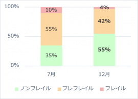 期間中、参加者は3か月に1度、フレイル状態のチェックを行いました。教室に参加する前の昨年7月と、5か月間運動を継続した12月の結果を比較すると、ノンフレイルと判定された方の割合が約20%増加、フレイル・プレフレイルと判断された割合は減少しました。また、参加者の多くで握力や5m歩行の数値の改善が見られ、運動量の変化や体の動かしやすさに変化を実感してもらうことができました。