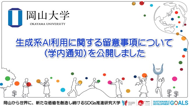 国立大学法人岡山大学(本部:岡山市北区、学長:那須保友)は、生成系AI利用に関する留意事項についての学内通知を、2023年4月21日に行い、同時に本学メインホームページで公開しましたので、お知らせします。