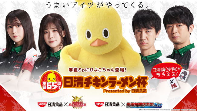 コラボ期間中はログインボーナスとしてひよこちゃんプチプロが登場します。ゲームにログインするだけで誰でも入手可能です。さらに、4月26日(水)、4月30日(日)、5月3日(水・祝)に「生誕65周年記念 日清チキンラーメン杯 Presented by 日清食品」を開催します。大会は『麻雀格闘倶楽部Sp』をインストールしていれば誰でも無料で参加可能で、日清食品オリジナルデザインの「日清牌」を使って行います。大会の上位者には「日清牌」(実物)や「日清チキンラーメン」など豪華なプレゼントを用意しています。大会には、Mリーグに参加中のプロチーム「KONAMI麻雀格闘倶楽部」選手に加え、多数プロ雀士が参戦予定です。