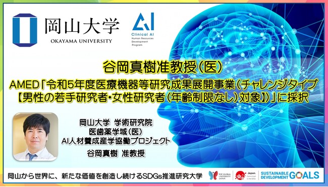 国立大学法人岡山大学(本部:岡山市北区、学長:那須保友)学術研究院医歯薬学域(医)AI人材養成産学協働プロジェクトの谷岡真樹准教授が、国立研究開発法人日本医療研究開発機構(AMED)の「令和5年度医療機器等研究成果展開事業(チャレンジタイプ【男性の若手研究者・女性研究者(年齢制限なし)対象】)」に採択されました。