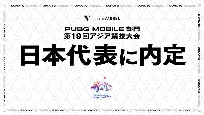 株式会社VARREL(東京都渋谷区、代表取締役社長:鈴木文雄)が運営するプロeスポーツチーム「DONUTS VARREL」のPUBG MOBILE部門は、2023年9月に中国・杭州で開催されるアジア最大のスポーツの祭典「第19回アジア競技大会」において、正式種目として初めて採用されたeスポーツの日本代表に内定したことをお知らせいたします。