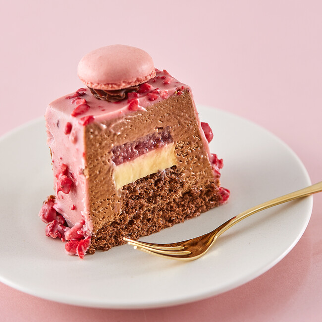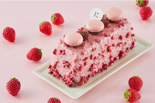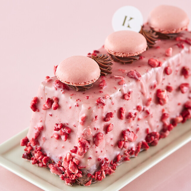 なめらかなチョコムースの中に、甘酸っぱい苺ジャム、ブリュレ、ココアスポンジを包み込み、サクサク食感のフリーズドライの苺を混ぜた苺風味のチョコレートをコーティングし、1つ1つ手作りのきのとや自慢のマカロンとガナッシュチョコレートを飾りました。