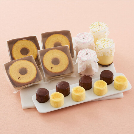 北海道産の素材にこだわり、手間をかけ、丁寧に焼き上げた「小さなバームクーヘン」や、素材や製法にこだわった優しい味わいの「たまごプリン」、「いちごプリン」、ふんわりなめらかな口溶けの「チーズスフレ」、「チョコレートスフレ」の詰合せです。