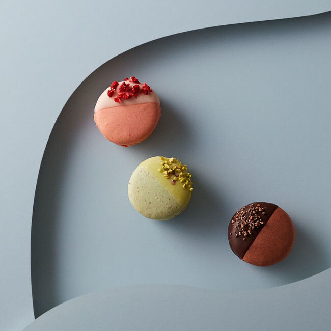 フランス仕込みのマカロン、ストロベリー、ピスターシュ、ショコラの3種をチョコレートにディップしました。