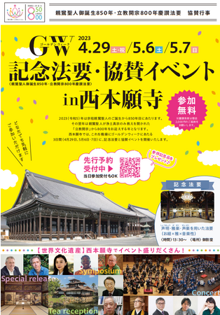 本願寺(西本願寺)「親鸞聖人御誕生850年・立教開宗800年慶讃法要」協賛行事としてコンサートやシンポジウムを開催(4/29・5/6・5/7)