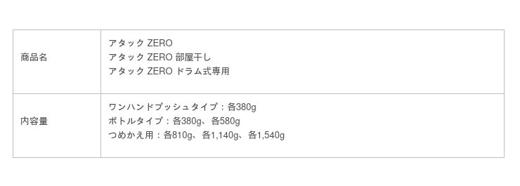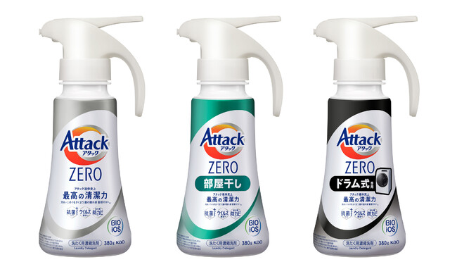 3.発売日/地域 2023年5月13日/全国4.商品特長【共通特長】アタック液体史上、最高の清潔力● 落ちにくい汚れゼロへ、生乾き臭ゼロへ、汚れ・ニオイをかくまう“菌の隠れ家”蓄積ゼロへ*5● “菌の隠れ家”除去*2成分最高*1レベル配合● 「高い洗浄力」と「環境へのやさしさ」の両立をめざした洗浄成分“バイオ IOS”を配合● 次世代消臭テクノロジー“抗菌+(プラス)*6、*7”● ウイルス除去*8● 洗たく槽防カビ*6● すすぎ1回でもOK● 蛍光剤無配合*9● 本体容器に100%再生プラスチック(PET)*10 を採用*1 アタック液体内において*2 繰り返し洗たくすることで多糖汚れ(菌の隠れ家)を除去できます*3 当社除菌洗剤・酸素系漂白剤*5 多糖汚れの蓄積を抑える効果*6 すべての菌・カビの増殖を抑制するわけではありません*7 抗菌に加えてニオイ菌のニオイ代謝を制御*8 すべてのウイルスを除去するわけではありません エンベロープタイプのウイルス1種で効果を検証*9 設備が蛍光剤配合洗剤と共用のため、微量の蛍光剤が検出されることがあります*10 着色剤、ラベルフィルム、ポンプ、およびキャップは除く【個別特長】アタックZERO● 清々しいリーフィブリーズの香り(微香)アタックZERO 部屋干し● “部屋干し臭撃退技術*4”で、部屋干しのニオイを根本から無臭化● サンシャインブリーズの香り(微香)*4 香料設計を含む消臭アプローチアタックZERO ドラム式専用● ドラム式洗たく機の水量・洗い方に適した配合設計● 節水対応ポリマー高配合*11で衣類の再汚染(黒ずみ)防止● 清々しいリーフィブリーズの香り(微香)*11 当社洗剤比各ワンハンドプッシュタイプ● 誰でも使いやすい形状● 手に持ってプッシュするだけで、片手で簡単に使用できるユニバーサルデザイン● 洗たく物の量に合わせて、洗剤量を自由に調節(5プッシュ = キャップ1杯)「アタック ZERO」シリーズの選び方