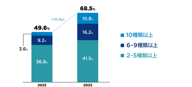 2.社外取引において、2種類以上のデジタルツールを使用しているのは7割、前年から2割増