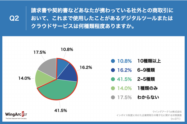 Q1で「0~20%未満の範囲で電子化」「社外との商取引には関わってない」以外をお答えの方に、「Q2.請求書や契約書などあなたが携わっている社外との商取引において、これまで使用したことがあるデジタルツールまたはクラウドサービスは何種類程度ありますか。」(n=371)と質問したところ、「10種類以上」が10.8%、「6~9種類」が16.2%、「2~5種類」が41.5%、社外取引において2種類以上のデジタルツールを利用している企業は68.5%という結果になりました。前年の調査から+18.9ptと大きく増加しています。特に、「10種類以上」と回答した企業は10.8%で前年+7.2pt増加しています。