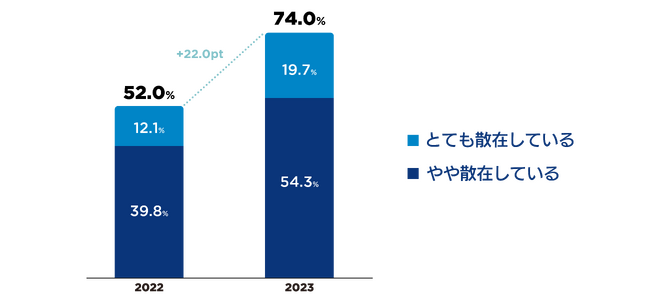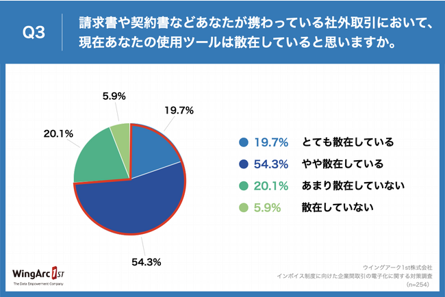 Q2で「2種類以上使用したことがある」とお答えの方に、「Q3.請求書や契約書などあなたが携わっている社外取引において、現在あなたの使用ツールは散在していると思いますか。」(n=254)と質問したところ、「とても散在している」が19.7%、「やや散在している」が54.3%、あわせて74.0%の企業が「ツールの散在」を実感している結果となりました。前年の調査から+22.0ptと大きく増加しました。