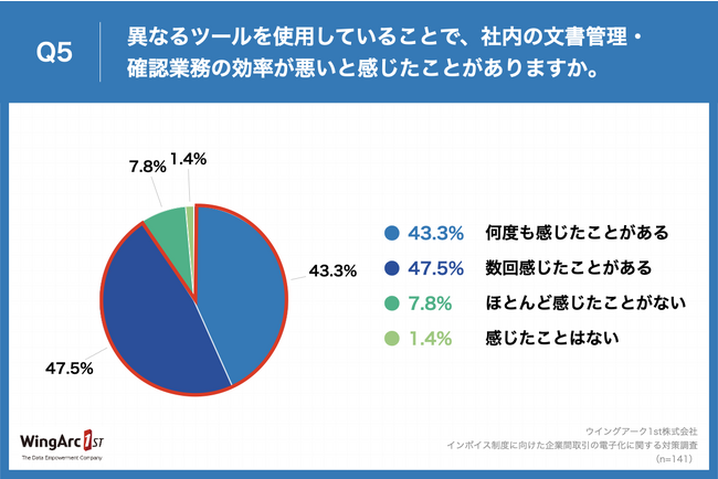 Q4で「異なるツールを使用している」と回答した方に、「Q5.異なるツールを使用していることで、社内の文書管理・確認業務の効率が悪いと感じたことがありますか。」(n=141)と質問したところ、「何度も感じたことがある」が43.3%、「数回感じたことがある」が47.5%、合わせて90.8%の企業が「業務効率が悪い」と実感している結果となりました。前年から+10.0ptと大きく増加しています。