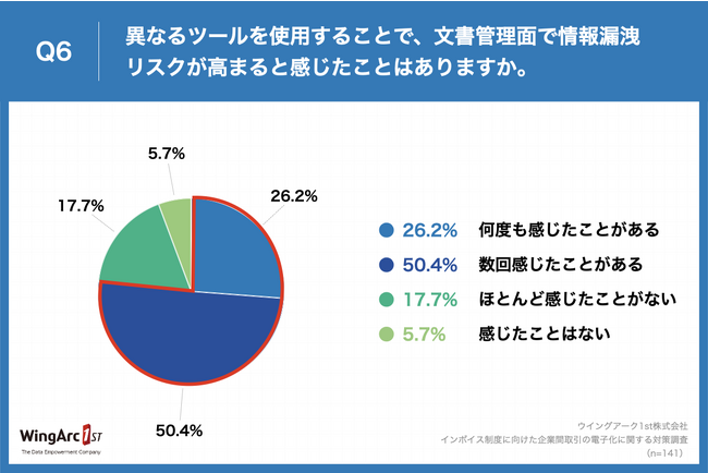 Q4で「異なるツールを使用している」と回答した方に、「Q6.異なるツールを使用することで、文書管理面で情報漏洩リスクが高まると感じたことはありますか。」(n=141)と質問したところ、「何度も感じたことがある」が26.2%、「数回感じたことがある」が50.4%、合わせて76.6%の企業が「情報漏洩リスクが高まる」と実感している結果になりました。前年から+13.0ptと大きく増加しています。
