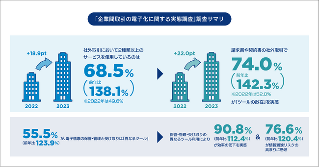 ・社外取引において2種類以上のサービスを使用しているのは68.5%(前年比138.1%)・請求書や契約書の社外取引で74.0%(前年比142.3%)がツールの散在を実感・55.5%(前年比123.9%)が、電子帳票の保管・管理と受け取りは異なるツールを利用・保管・管理・受け取りの異なるツール利用により、90.8%(前年比112.4%)が効率の低下を実感、76.6%(前年比120.4%)が情報漏洩リスクの高まりを懸念