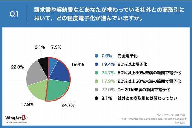 「Q1.請求書や契約書などあなたが携わっている社外との商取引において、どの程度電子化が進んでいますか。」(n=531)と質問したところ、「完全電子化」が7.9%、「80%以上電子化」が19.4%、「50%以上80%未満の範囲で電子化」が24.7%と合わせて52.0%の企業が社外取引において電子化が進んでいる結果になりました。