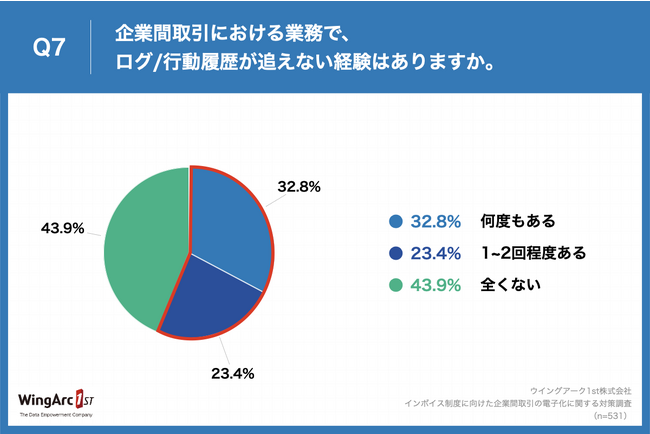 「Q7.企業間取引における業務で、ログ/行動履歴が追えない経験はありますか。」(n=531)と質問したところ、「何度もある」が32.8%、「1~2回程度ある」が23.4%という回答となりました。