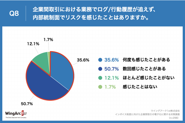 Q7で「何度もある」「1~2回程度ある」と回答した方に、「Q8.企業間取引における業務でログ/行動履歴が追えず、内部統制面でリスクを感じたことはありますか。」(n=298)と質問したところ、「何度も感じたことがある」が35.6%、「数回感じたことがある」が50.7%という回答となりました。