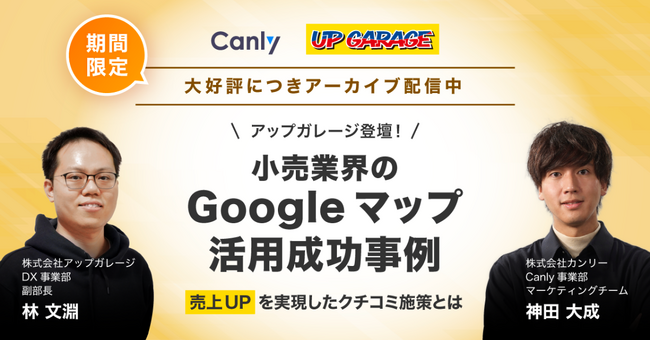 Googleビジネスプロフィール(旧・Googleマイビジネス)・HP・各SNSの一括管理サービス「Canly(カンリー)」の開発・提供を行う株式会社カンリー(所在地:東京都渋谷区、代表取締役:辰巳 衛,秋山 祐太朗)は、ウェビナー『アップガレージ登壇!小売業界のGoogleマップ活用成功事例~売上アップを実現したクチコミ施策とは~』を期間限定で無料配信することとなりましたのでご案内いたします。